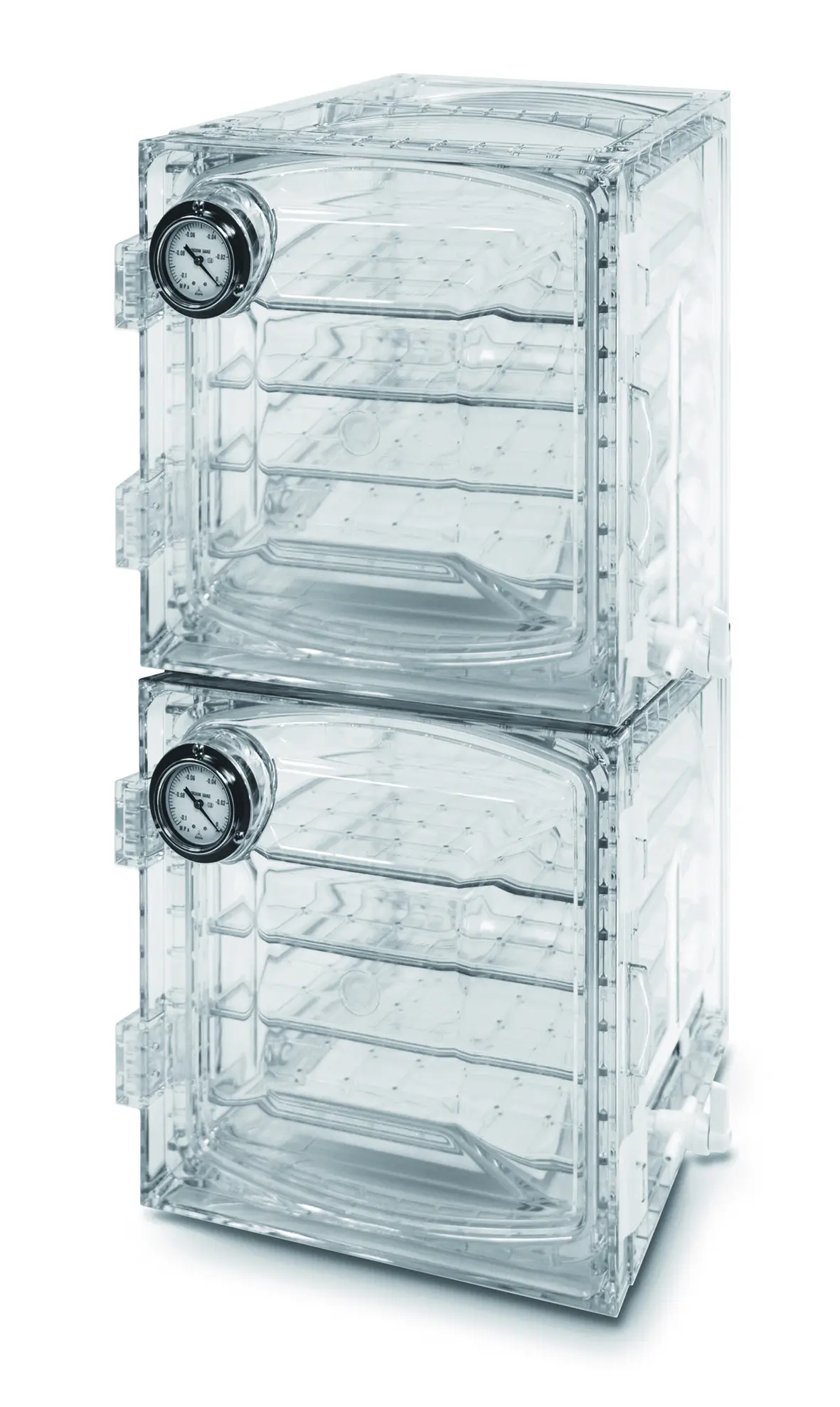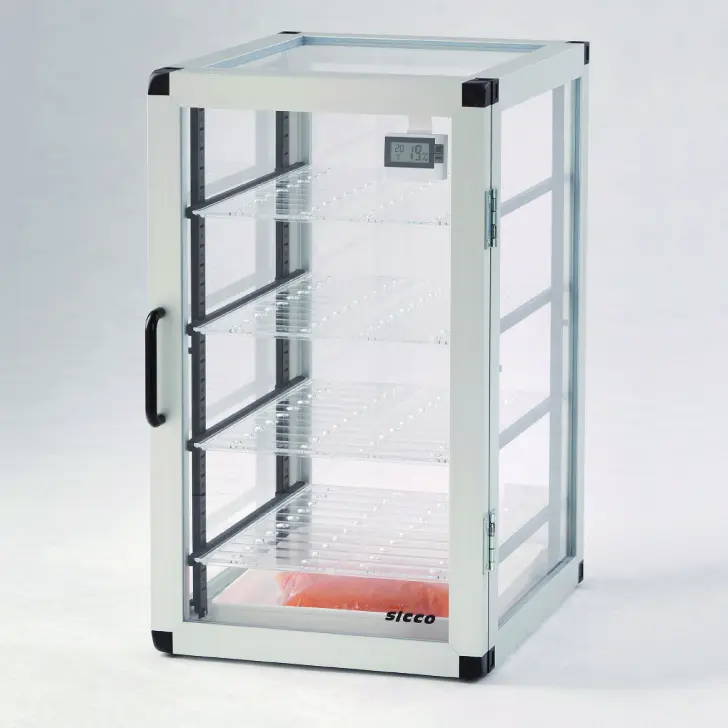 Ein Exsikkatorschrank ohne Vakuumpumpe nutzt ein Trockenmittel, um die Feuchtigkeit im Inneren zu reduzieren. Das Trockenmittel, wie Silikagel oder Phosphorpentoxid, absorbiert die Feuchtigkeit aus der Luft und hält die Umgebung trocken. Sie bieten mehr Platz als herkömmliche Exsiaktoren aus Glas.