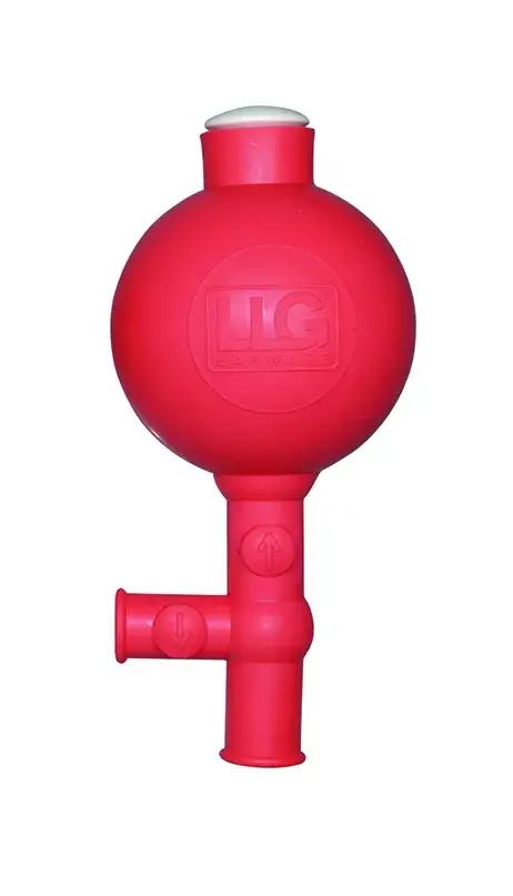 Pipettierball: Ein einfaches, handbetriebenes Gerät, das auf das obere Ende der Pipette aufgesetzt wird. Durch Drücken und Loslassen des Balls kann die Flüssigkeit angesaugt und abgelassen werden.