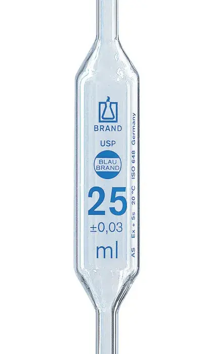 Messpipetten und Vollpipetten mit den Klassen A und AS haben die höchste Genauigkeitsklasse. Sie haben eine identische Fehlergrenzen die nach DIN EN ISO festgelegt ist. Bei der Klasse AS, justiert auf 'Ex' steht das "S" für Schnellablauf.