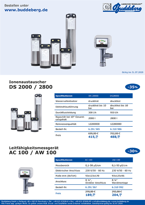 Unsere Ionenaustauscher liefern reproduzierbares vollentsalztes Wasser mit permanent niedriger Leitfähigkeit nahezu über den gesamten Kapazitätszeitraum und erfüllen alle gängigen Normen wie ASTM, CLSI und DIN EN 285/13060.
