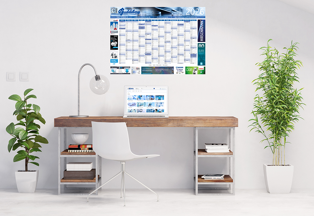 Fordern Sie heute Ihr kostenfreies Exemplar des beliebten Buddeberg Wandkalenders für 2026 an. Unser DIN A1 Wandkalender ist beschreibbar und eignet sich somit bestens für die Urlaubs- und Terminplanung.Auslieferung ab Mitte Oktober – sichern Sie sich jetzt Ihr Exemplar!